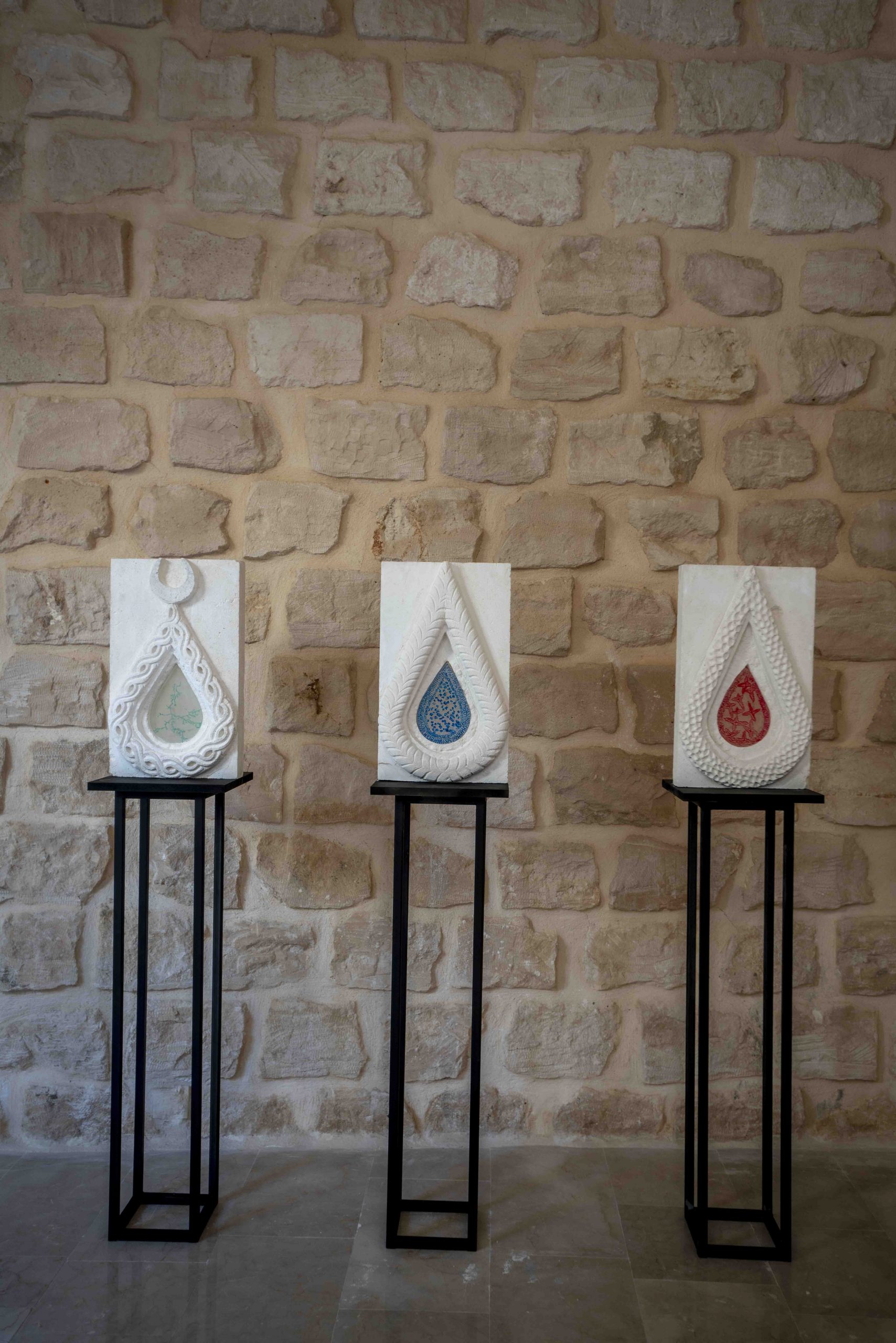 The artwork “Story of Saltwater” is based on the drop motif that is frequently used in Mardin architecture. The artist intervenes with different materials on top of the drop motifs that are engraved by the artisan on Mardin stone. In the intervention, different motifs within the drop patterns are carved and colored with epoxy cast.