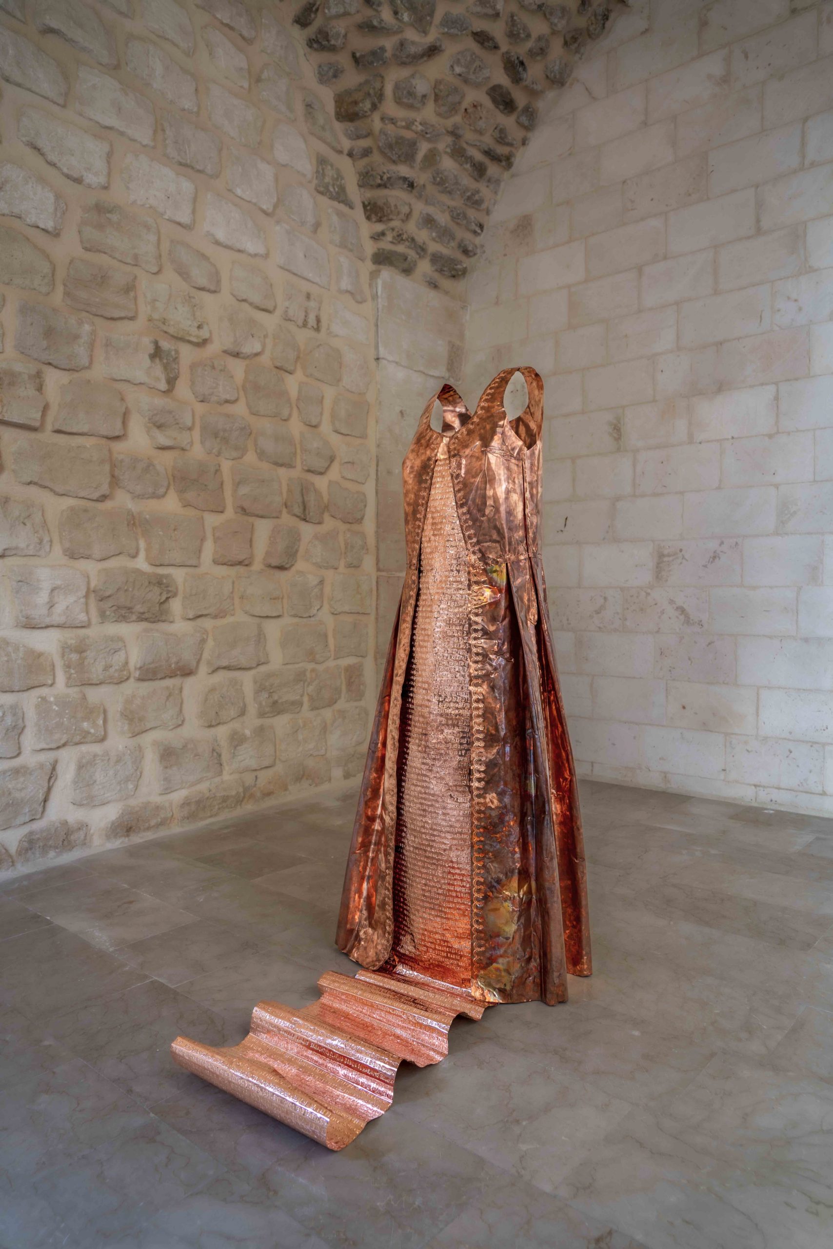 In the artwork “Shield” a woman’s dress (a shield) is designed from copper sheets as a wearable sculpture. Hard copper sheets are given form with heat treatment. The traditional motifs encircling the dress are printed by the copper master. During the production process, the artist, impressed and influenced by the artisan’s egalitarian statements on women’s rights, wrote an epigraph with printing technique on a copper plate that hides itself within the dress.